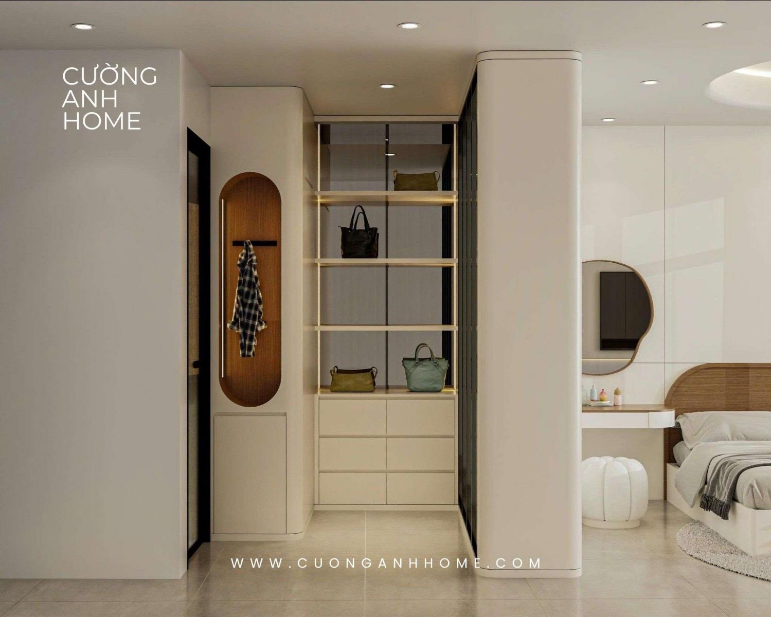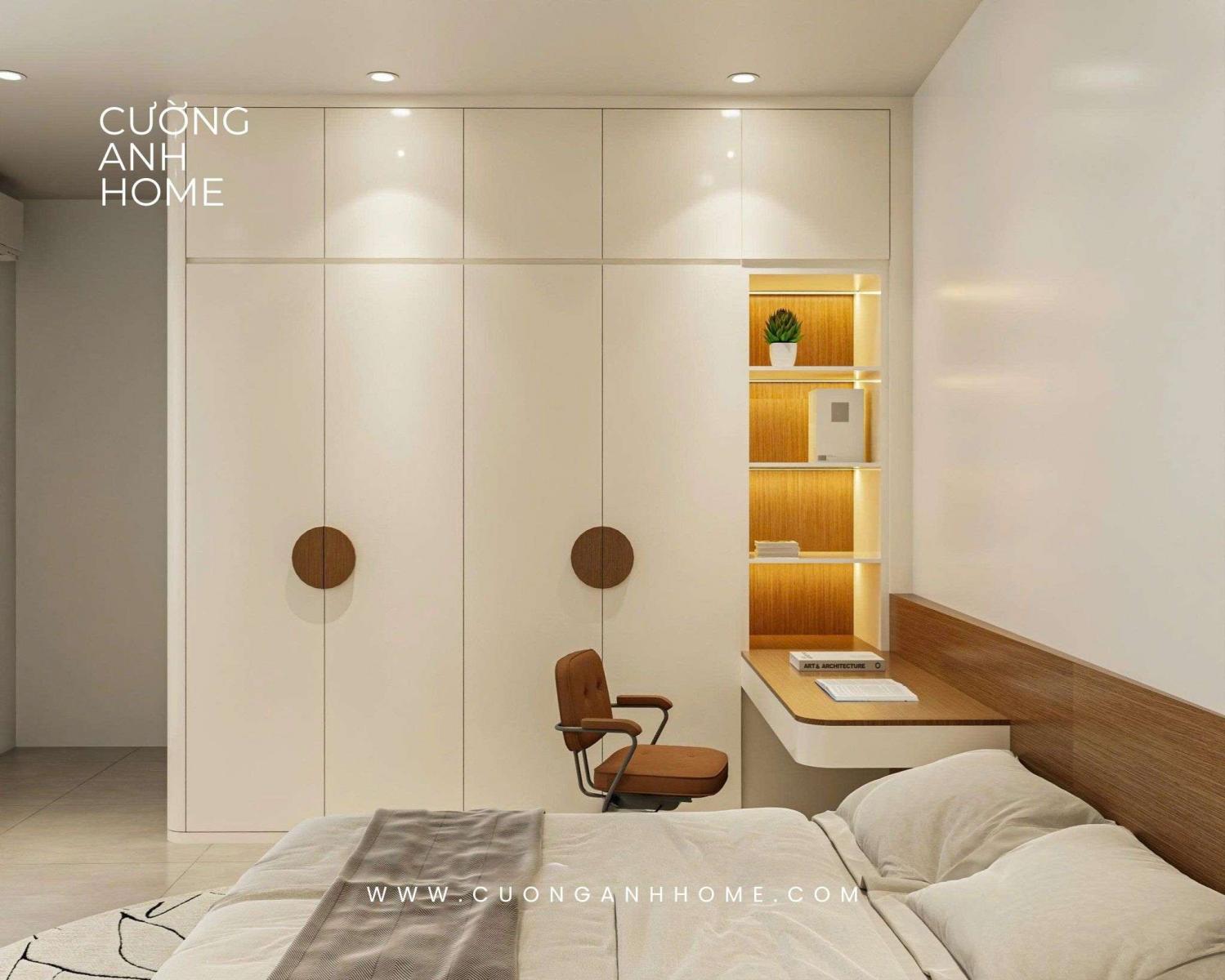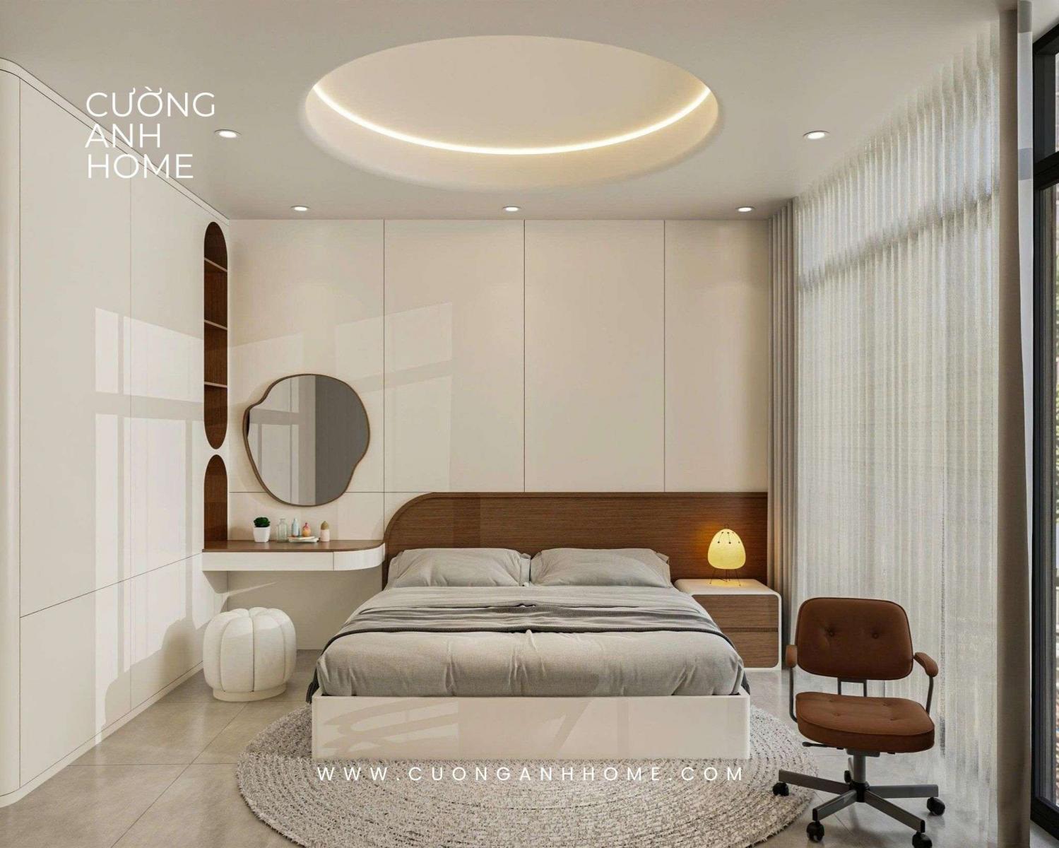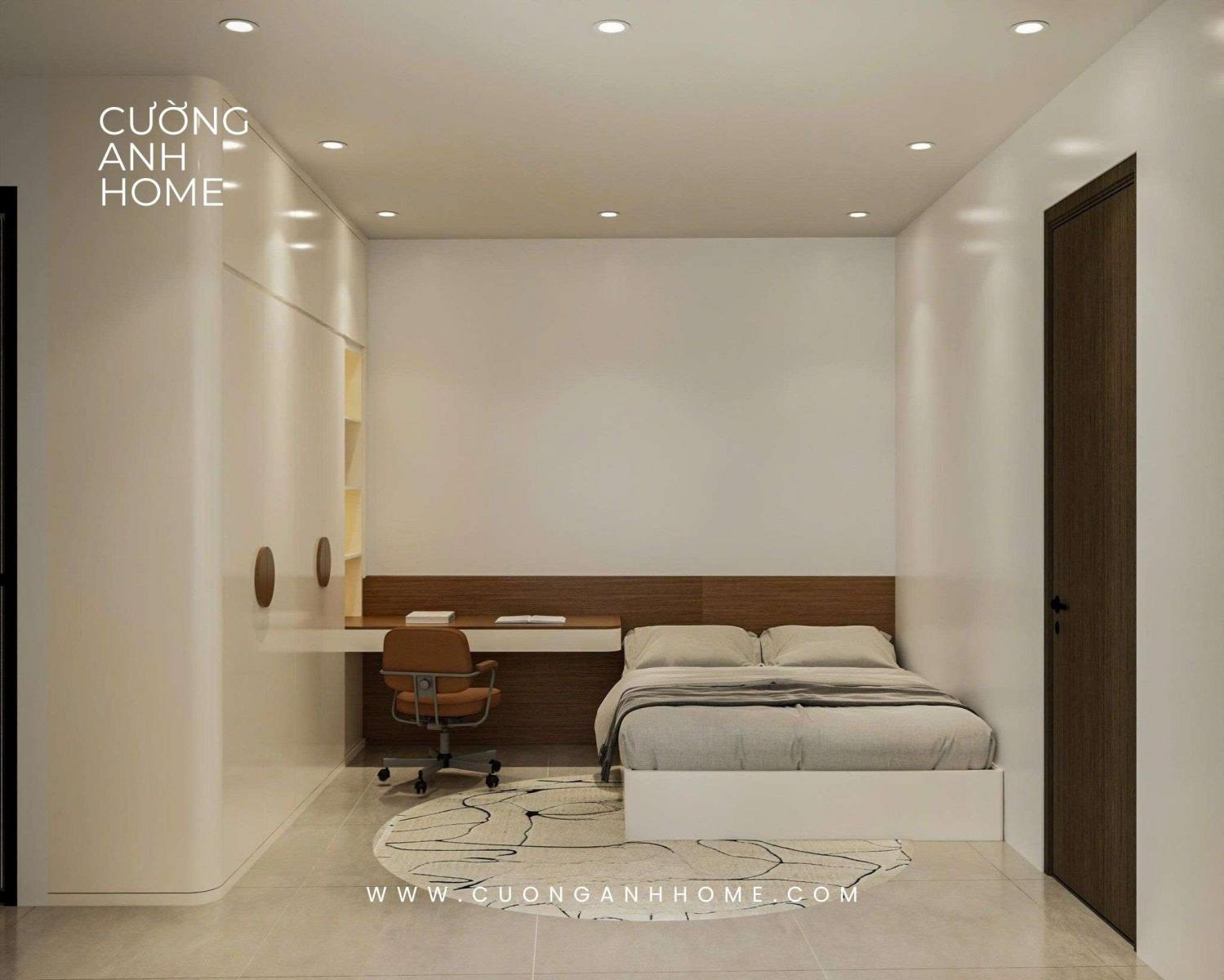 Đối với phòng ngủ nhỏ, Cường Anh Home ưu tiên sử dụng hệ nội thất tích hợp: Giường ngủ liền bàn học và tủ quần áo. Cách bố trí này giúp giải phóng không gian sàn, tạo môi trường học tập và nghỉ ngơi thông thoáng cho các thành viên.