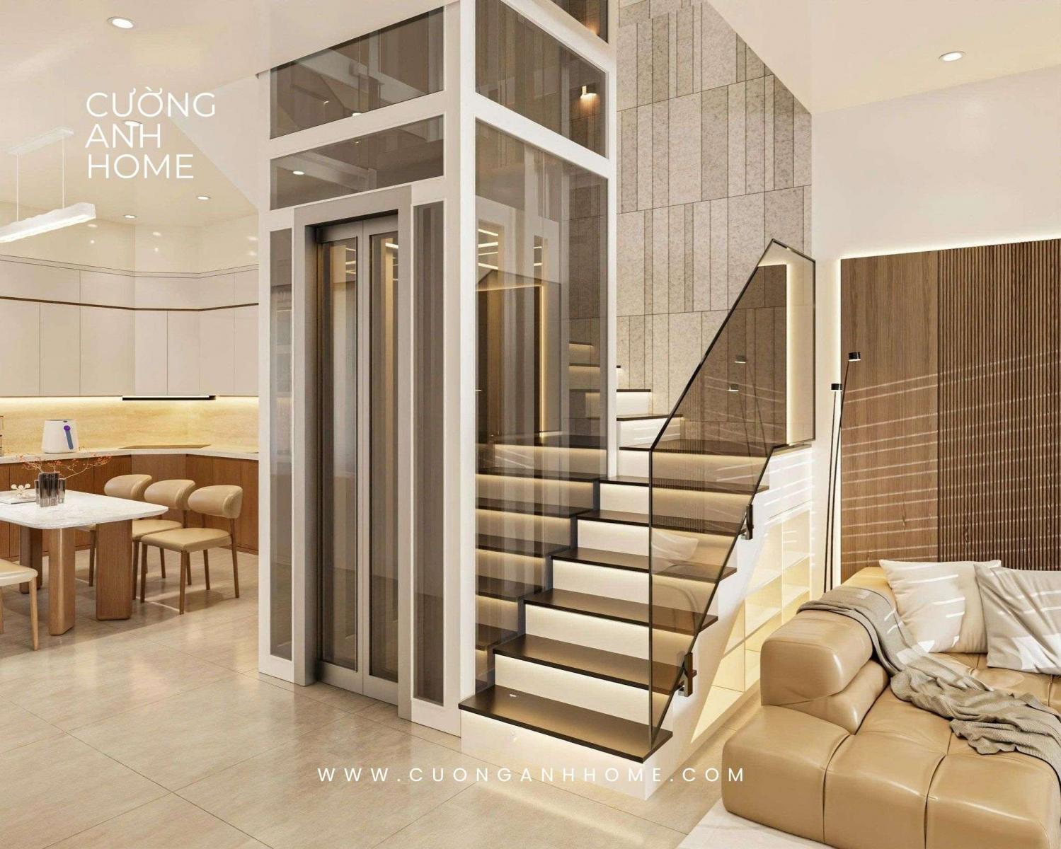 Với cấu trúc nhà phố nhiều tầng, anh Sơn đã lựa chọn lắp đặt thang máy kính ngay cạnh cầu thang bộ. Cường Anh Home đã xử lý phần khung bao và ốp gỗ tinh xảo, giúp thang máy trở thành một khối kiến trúc xuyên thấu, đón ánh sáng tự nhiên cho toàn bộ ngôi nhà.