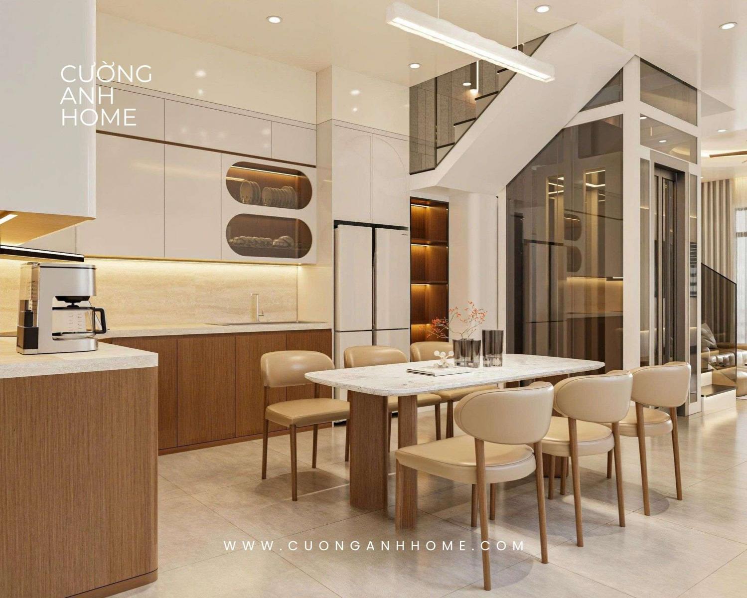 Khu vực bếp sử dụng hệ tủ chữ L kịch trần với hai tone màu trắng - vân gỗ chủ đạo. Bề mặt gỗ công nghiệp chống ẩm cao cấp giúp gia chủ dễ dàng vệ sinh. Bàn ăn mặt đá vân mây kết hợp ghế da đồng màu tạo nên sự liên kết tuyệt vời với phòng khách.