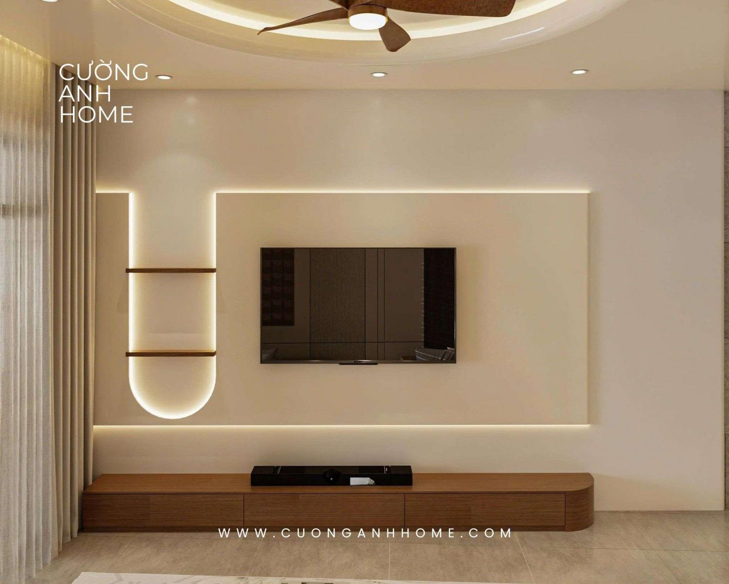 Toàn cảnh phòng khách phong cách hiện đại, Chi tiết vách TV bo cong tinh tế