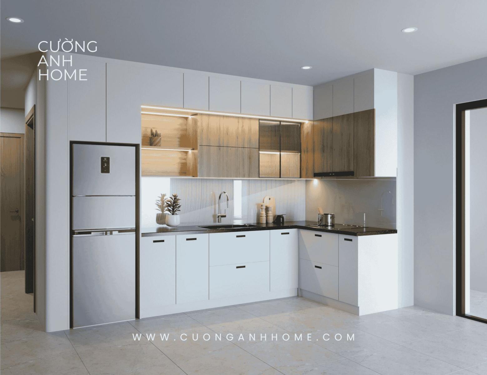 Hình ảnh thực tế hệ tủ bếp chữ L phối màu trắng sứ và vân gỗ sáng, tích hợp khoang tủ lạnh gọn gàng