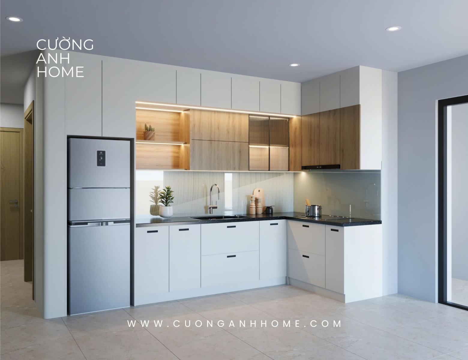 Cường Anh Home tính toán kỹ lưỡng vị trí "tam giác vàng" giữa tủ lạnh - bồn rửa - bếp nấu, giúp người nội trợ di chuyển thuận tiện và tiết kiệm thời gian nhất.