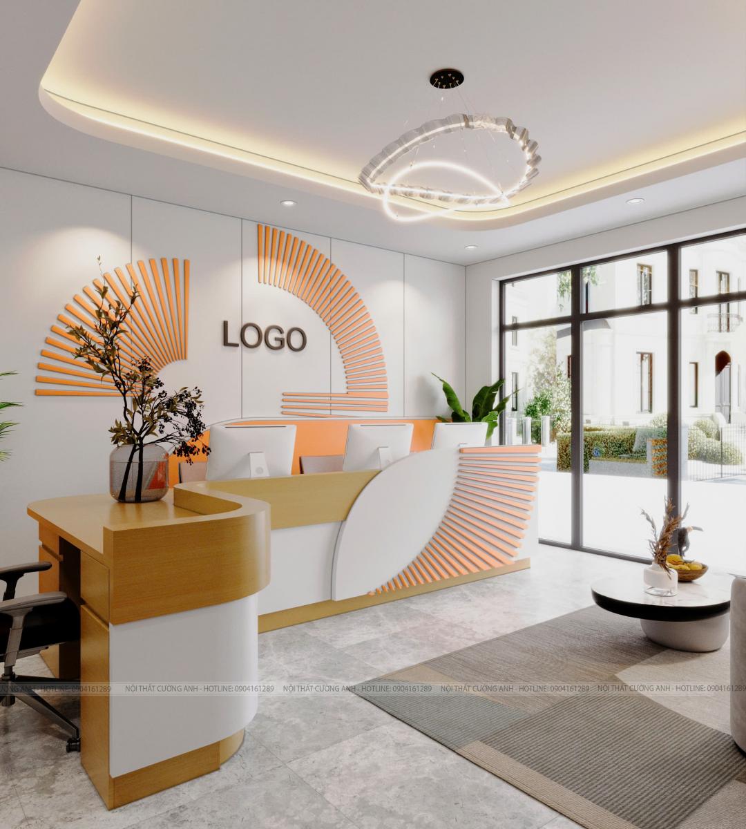 Sảnh lễ tân được thiết kế để gây ấn tượng mạnh mẽ với các đường cong uốn lượn tại quầy lễ tân uốn lượn tinh tế. Vách logo phía sau sử dụng các nan gỗ sắp xếp theo hình cánh cung màu cam rực rỡ, biểu tượng cho sự năng động và phát triển. Không gian chờ được bố trí sofa êm ái cạnh vách trang trí hình vòm có đèn hắt sáng halo sang trọng.