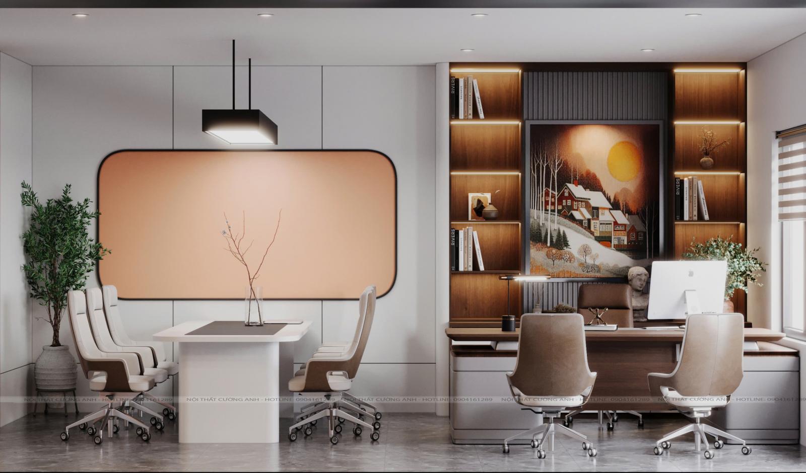 Dành riêng cho công tác quản lý và tư vấn chuyên sâu, phòng giám đốc được thiết kế đẳng cấp với hệ tủ sách kịch trần tích hợp đèn LED và tranh nghệ thuật khổ lớn. Hệ bàn họp trắng hiện đại kết hợp với ghế xoay cao cấp tạo nên không gian làm việc truyền cảm hứng cho đội ngũ lãnh đạo.