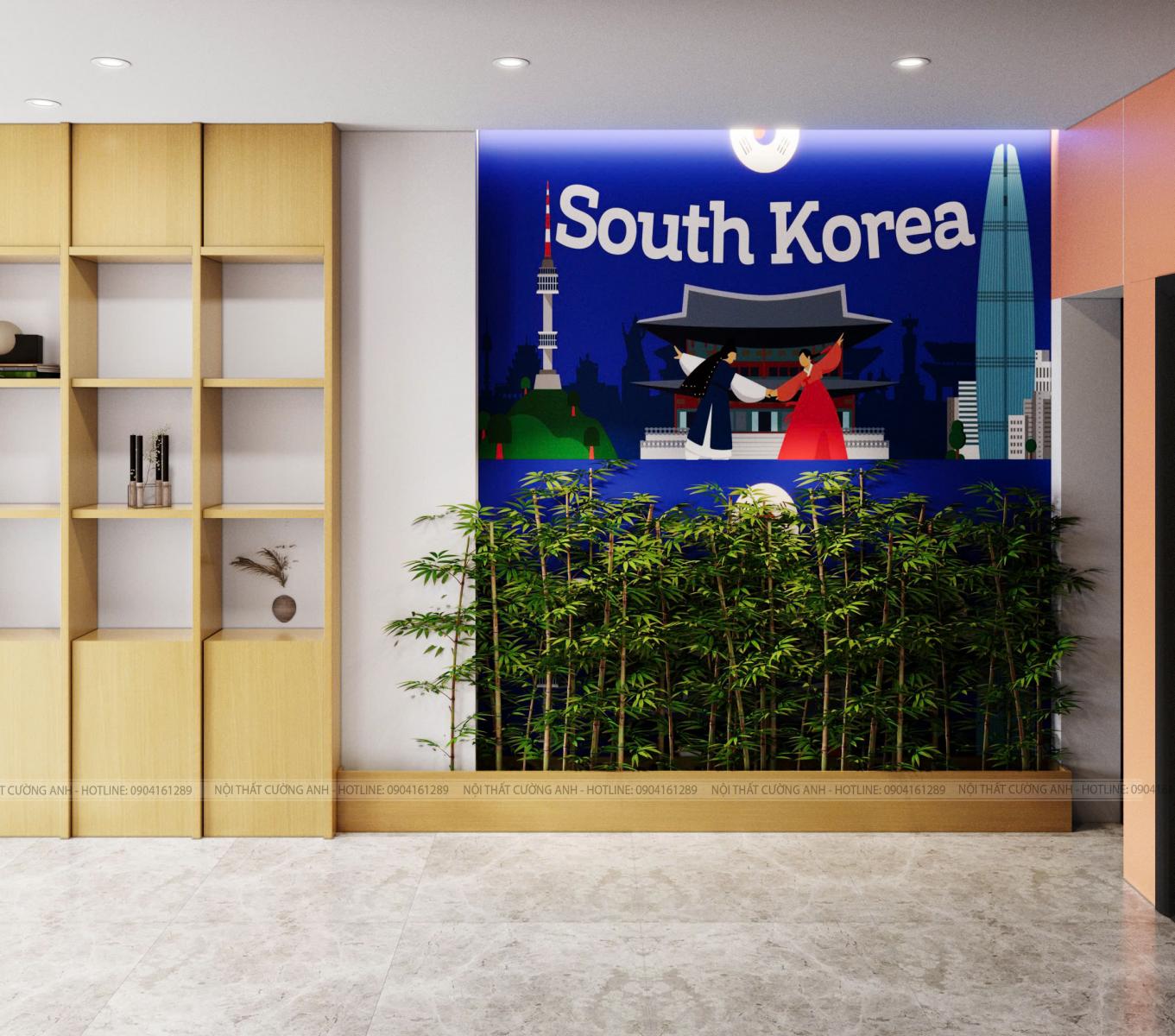Điểm độc đáo của trung tâm là các mảng tường trang trí mang đậm dấu ấn Hàn Quốc với tranh lớn mô phỏng danh lam thắng cảnh và hàng tre xanh mát, tạo không gian "check-in" lý tưởng cho học viên.