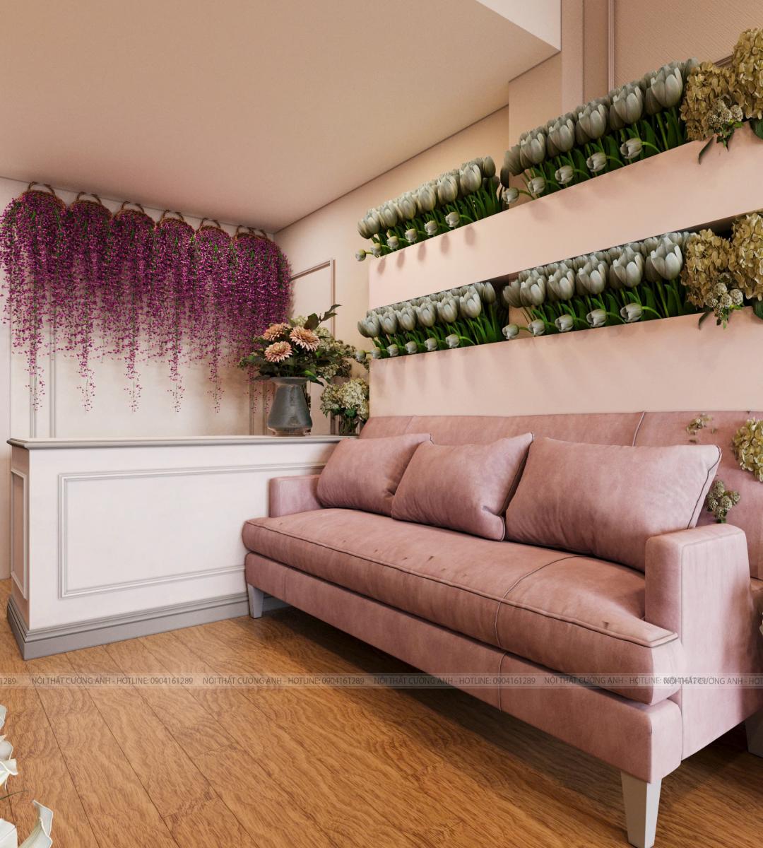 Mặc dù tập trung hoàn toàn vào mô hình shop hoa tươi, kiến trúc sư của Cường Anh Home vẫn dành một góc nhỏ trang trọng với bộ sofa màu hồng pastel. Đây là nơi khách hàng có thể ngồi chờ các nghệ nhân cắm hoa hoặc nhận tư vấn trực tiếp, tạo nên cảm giác phục vụ chu đáo và đẳng cấp (VIP Service).