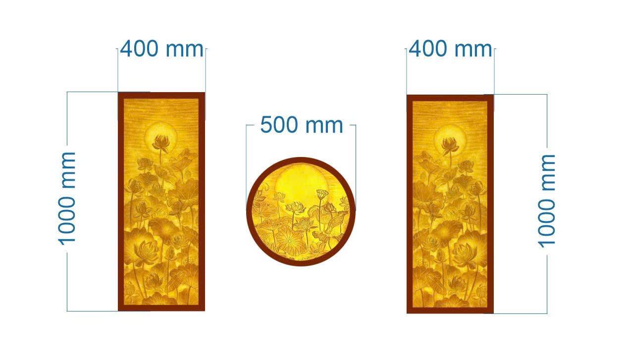 Thông số kỹ thuật hệ tranh đèn sen: Hai vách đứng kích thước 400x1000mm và tranh tròn đường kính 500mm tạo điểm nhấn ánh sáng ấm cúng.
