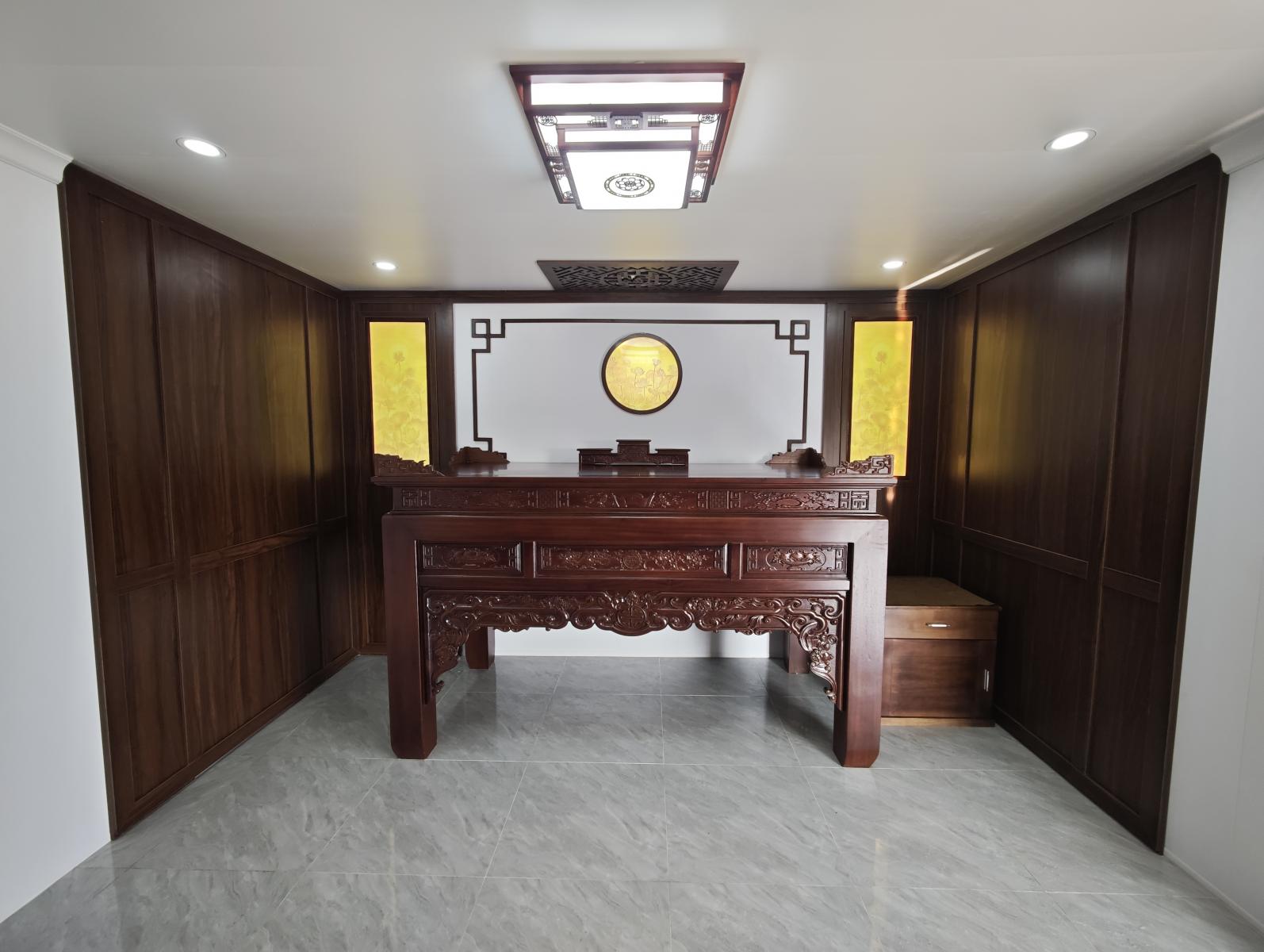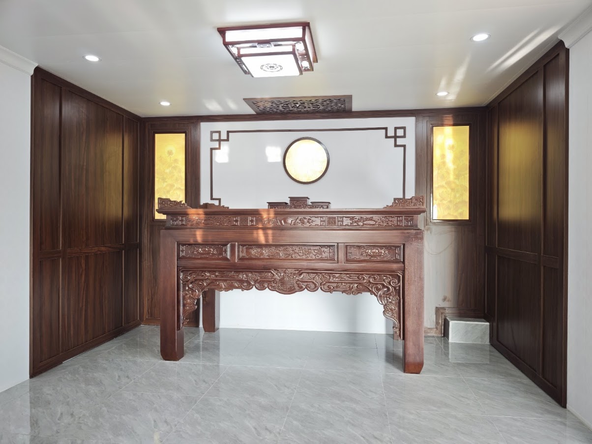 - Kỹ thuật: Các chi tiết CNC chữ Vạn và hệ đèn tranh được tích hợp khéo léo, tạo luồng ánh sáng dịu nhẹ, linh thiêng.