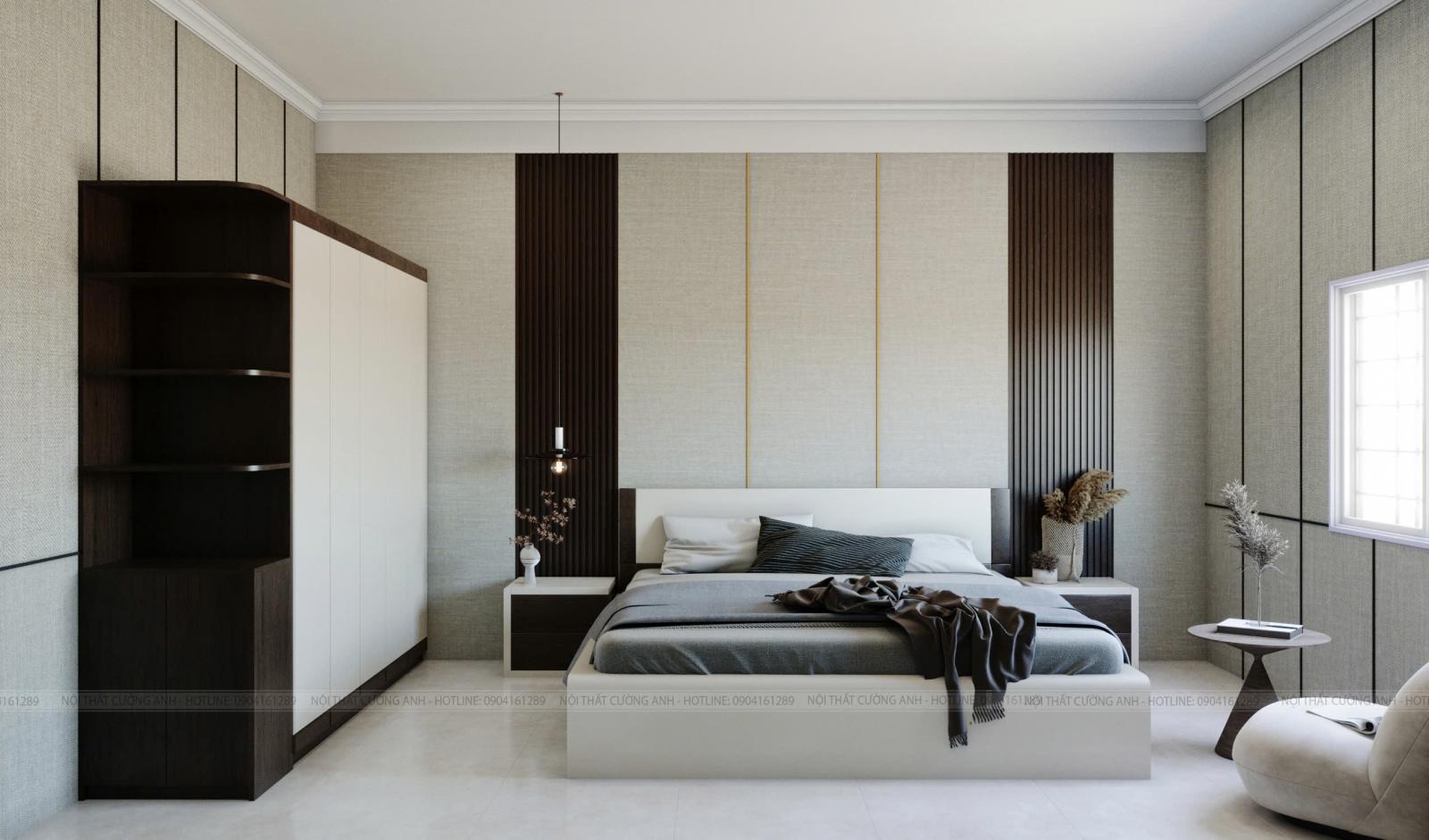 Phòng ngủ là nơi vỗ về cảm xúc sau ngày dài. Chúng tôi sử dụng vách nan gỗ bọc nỉ cùng tông màu trầm để tạo chiều sâu và sự ấm cúng cho không gian nghỉ ngơi.