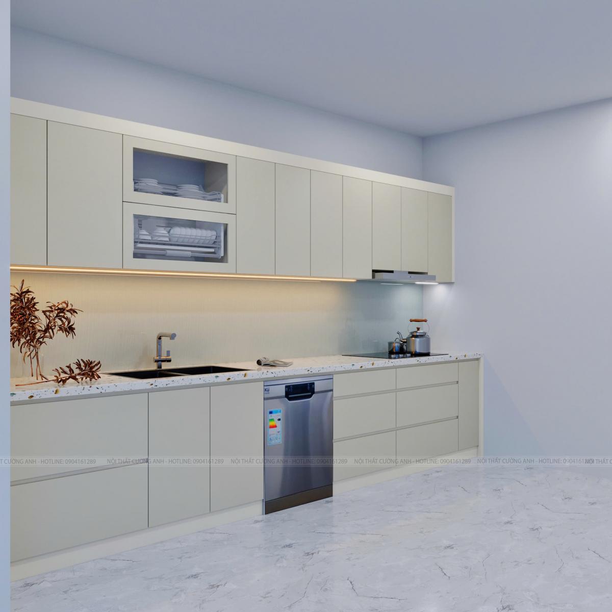 Mọi khoang chứa đồ, từ vị trí đặt máy rửa bát đến giá bát nâng hạ, đều được tối ưu theo thói quen sinh hoạt của người nội trợ Việt.
