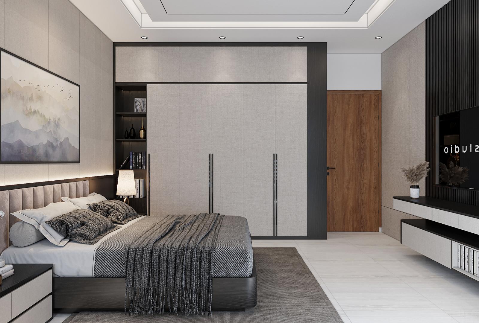 Giường ngủ bọc da, tủ áo âm tường tiện ích.