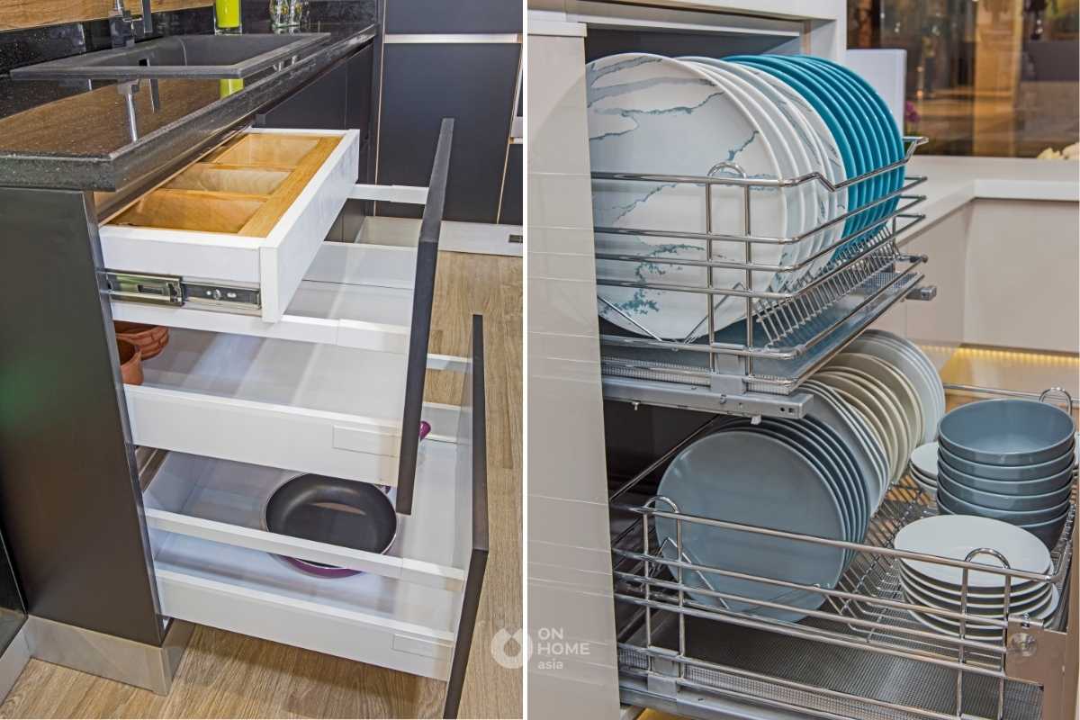 Thiết kế nội thất phòng bếp với giá để bát, tủ dụng cụ nhà bếp thông minh