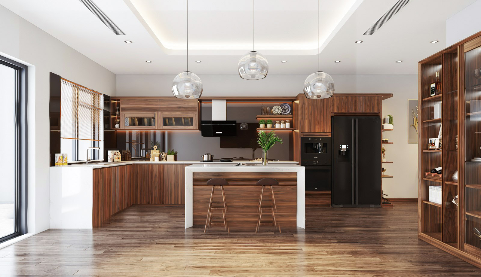 Thiết kế nội thất nhà bếp bằng gỗ tự nhiên cao cấp, sang trọng.