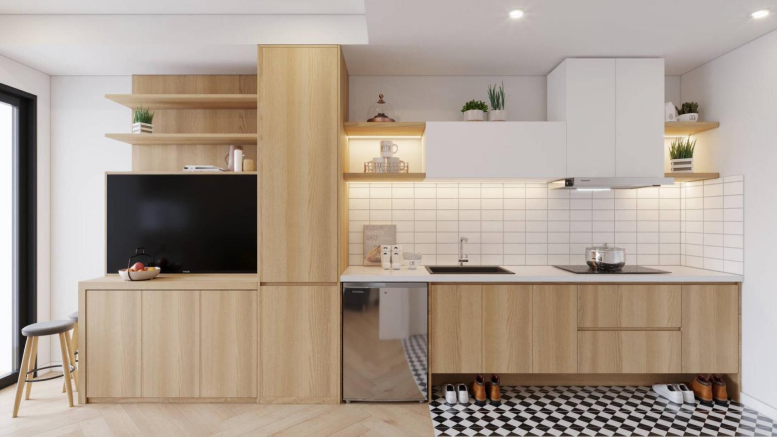 Thiết kế nội thất phòng bếp với ngăn tủ đựng đồ thông minh.