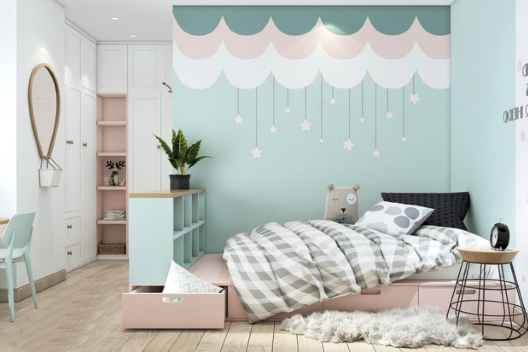 Bạn có thể thiết kế hình vẽ mà bé yêu thích hoặc những bức tranh trong truyện cổ tích hoặc sử dụng giấy dán tường có in họa tiết nhiều màu sắc, dễ thương, vẽ tranh tường, vẽ tranh 3d phòng ngủ trẻ em ngộ nghĩnh.