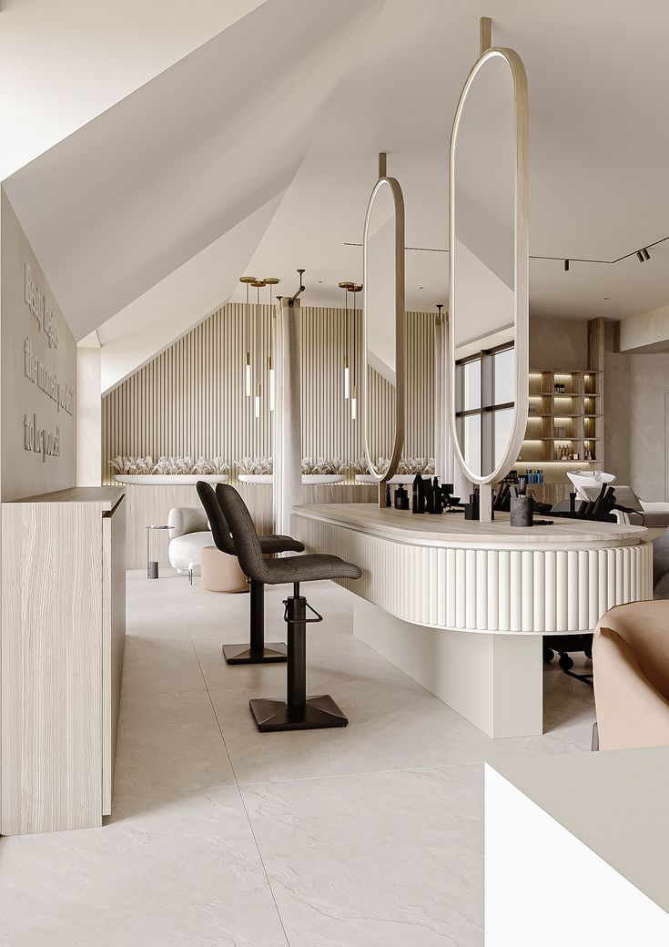Trong salon cần có bàn ghế cho khách ngồi đợi , bàn gội đầu , quầy thu ngân, tủ đựng đồ ...tất cả cần phải được bài trí thật khoa học, và tối ưu công năng nhưng phải đảm bảo được thẩm mỹ của salon.