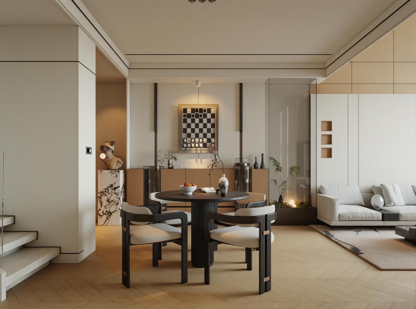 • Bố trí: Bàn ăn tròn đặt giữa không gian liên thông giúp luồng giao thông trong căn hộ Duplex luôn mạch lạc, thuận tiện cho những bữa tiệc gia đình.