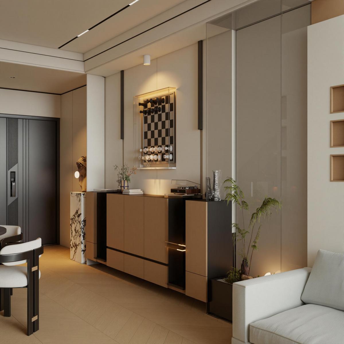 • Nội thất: Bộ sofa chữ I kết hợp bàn trà đá marble đen-trắng tạo điểm nhấn đối lập mạnh mẽ trên nền sàn gỗ xương cá, mang lại vẻ đẹp chuẩn "Penthouse".