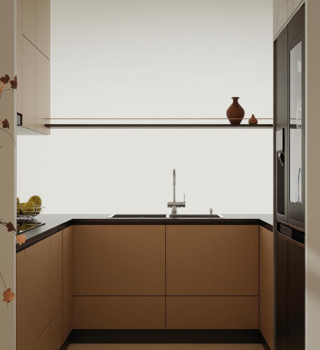 • Hệ tủ bếp: Toàn bộ hệ tủ kịch trần được sản xuất từ chất liệu gỗ công nghiệp MDF chống ẩm, bề mặt phủ lớp hoàn thiện mịn màng, không tay nắm để tạo vẻ tối giản tuyệt đối.