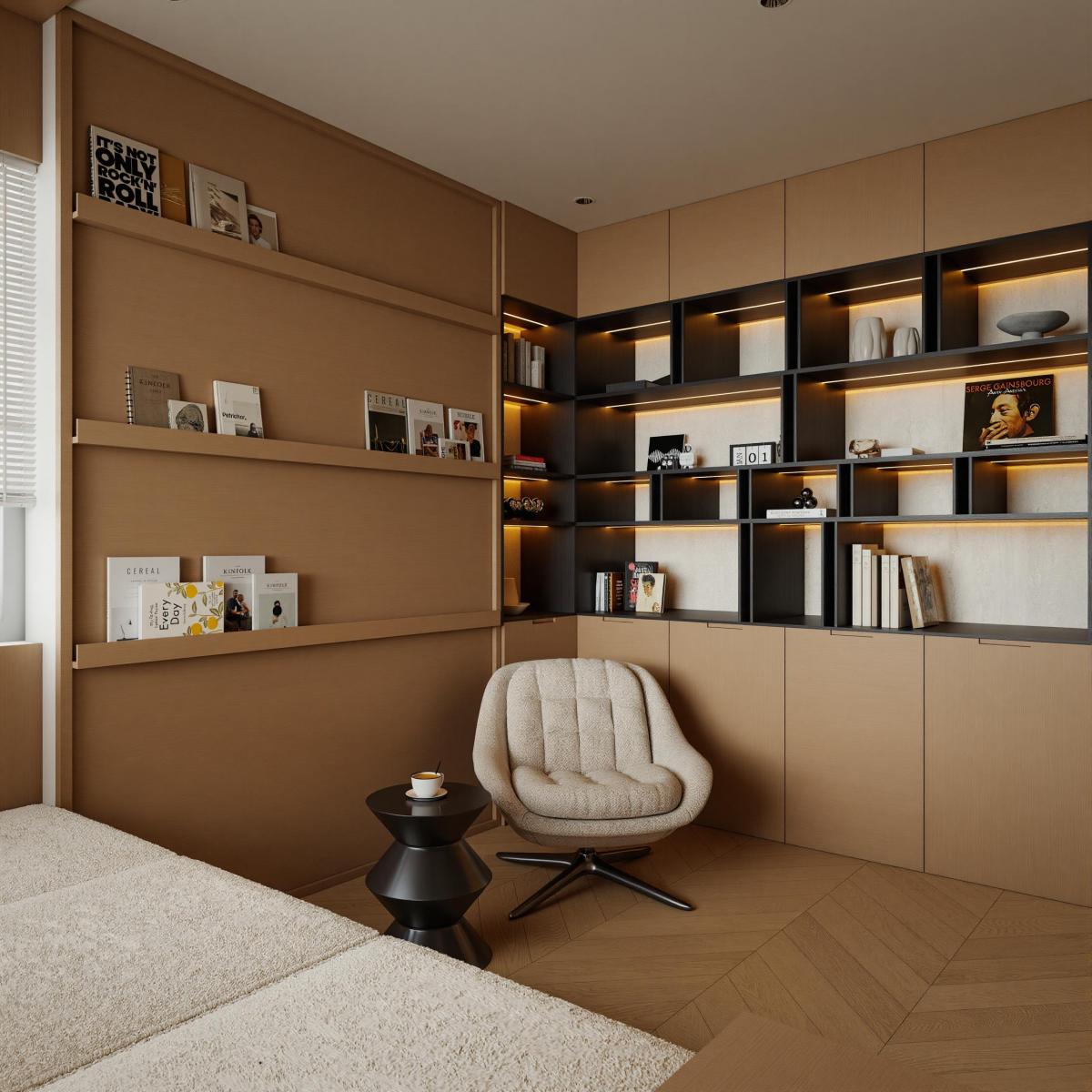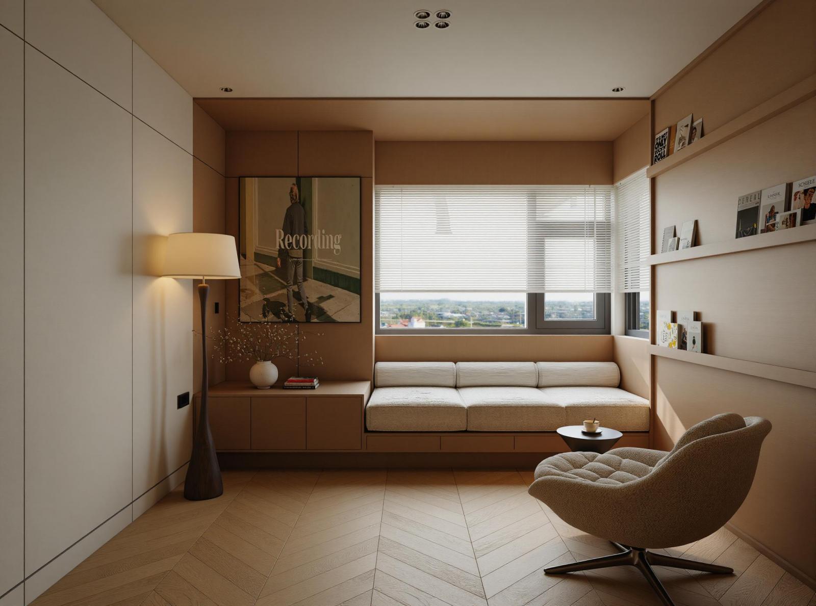 • Góc Chill: Một chiếc ghế thư giãn đặt cạnh cửa sổ lớn với tầm nhìn bao trọn thành phố, biến phòng ngủ thành một resort thu nhỏ ngay tại gia.