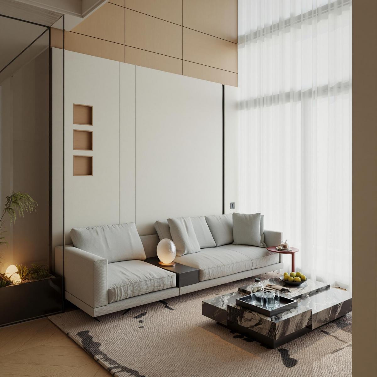 Phòng khách của căn hộ Duplex thường có lợi thế về chiều cao. Chúng tôi tận dụng tối đa hệ cửa kính lớn và rèm voan hai lớp để lấy trọn ánh sáng tự nhiên.