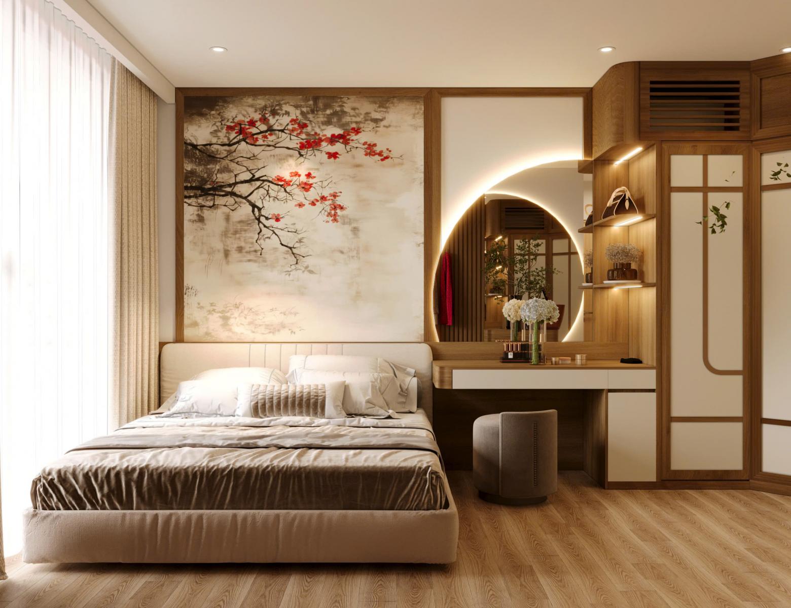 - Giải Pháp Vách Ốp Gần Gũi: Thiết kế vách ốp tranh phong cảnh kết hợp vách ngăn nan gỗ truyền thống. Ý tưởng này giúp ánh sáng khuếch tán mềm mại, tạo chiều sâu và cảm giác thư thái cho căn phòng theo đúng tinh thần Nhật Bản.