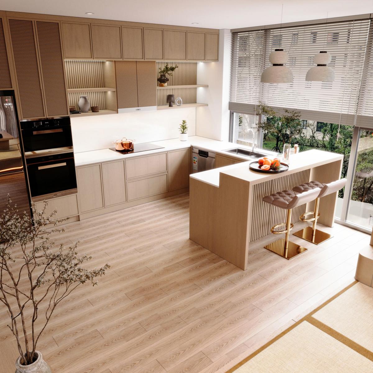 - Thiết Kế Hệ Tủ Nan Gỗ: Tủ bếp trên và quầy bar được thiết kế với chi tiết nan gỗ, vừa thẩm mỹ vừa đảm bảo thông thoáng. Thiết bị lớn được thiết kế âm tủ, mang lại bề mặt tối giản và hiện đại.