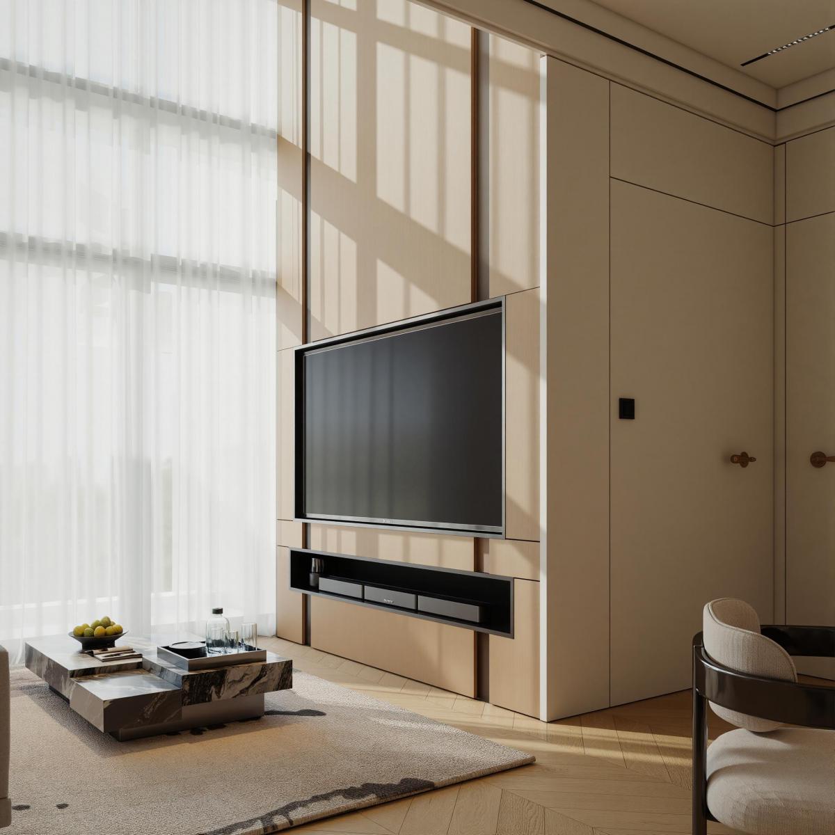 • Nội thất: Bộ sofa chữ I kết hợp bàn trà đá marble đen-trắng tạo điểm nhấn đối lập mạnh mẽ trên nền sàn gỗ xương cá, mang lại vẻ đẹp chuẩn "Penthouse".