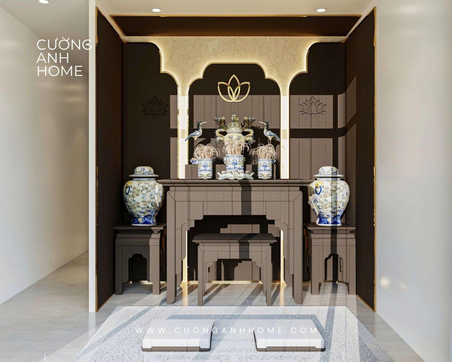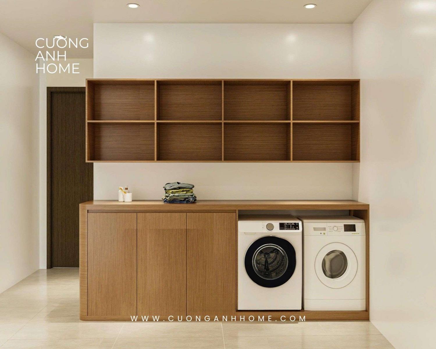 Phòng thờ được thiết kế trang nghiêm với vách hậu CNC họa tiết hoa sen và ánh sáng vàng ấm. Bên cạnh đó, khu vực giặt đồ cũng được quy hoạch chuyên nghiệp với hệ tủ ôm trọn máy giặt, mang lại sự gọn gàng tuyệt đối cho nhà phố.