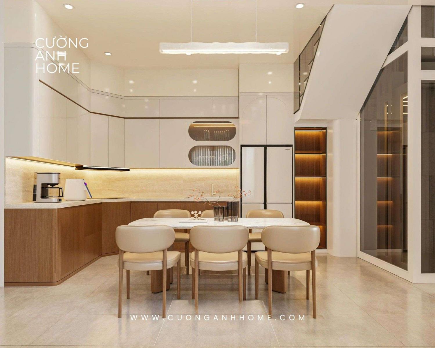 Khu vực bếp sử dụng hệ tủ chữ L kịch trần với hai tone màu trắng - vân gỗ chủ đạo. Bề mặt gỗ công nghiệp chống ẩm cao cấp giúp gia chủ dễ dàng vệ sinh. Bàn ăn mặt đá vân mây kết hợp ghế da đồng màu tạo nên sự liên kết tuyệt vời với phòng khách.