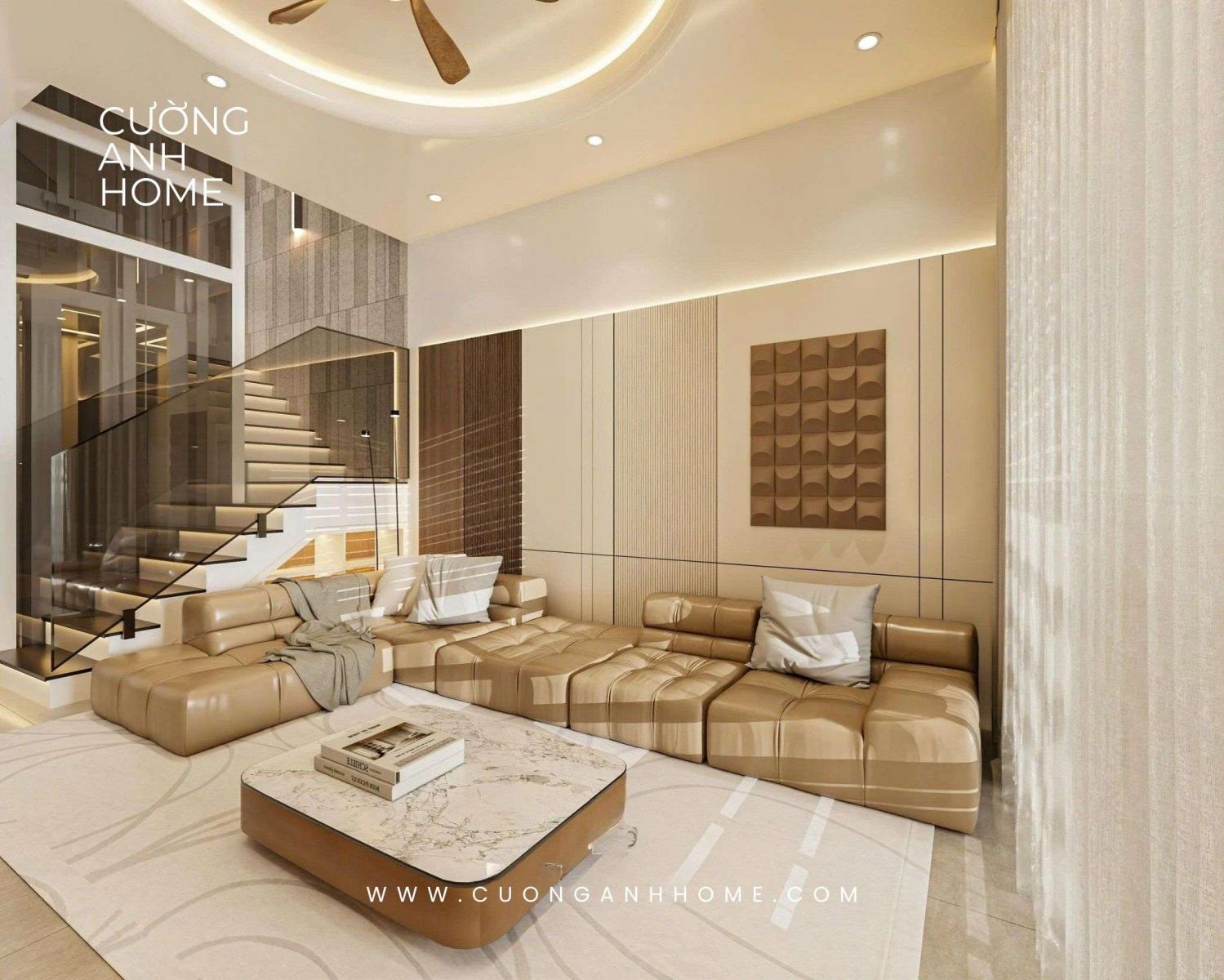 Không gian phòng khách gây ấn tượng với bộ Sofa khối màu beige và vách tivi bo cong mềm mại. Việc loại bỏ các góc cạnh thô cứng giúp căn phòng trở nên thanh thoát và an toàn hơn. Hệ đèn LED gián tiếp được tính toán kỹ lưỡng để tạo chiều sâu cho mảng tường trang trí.