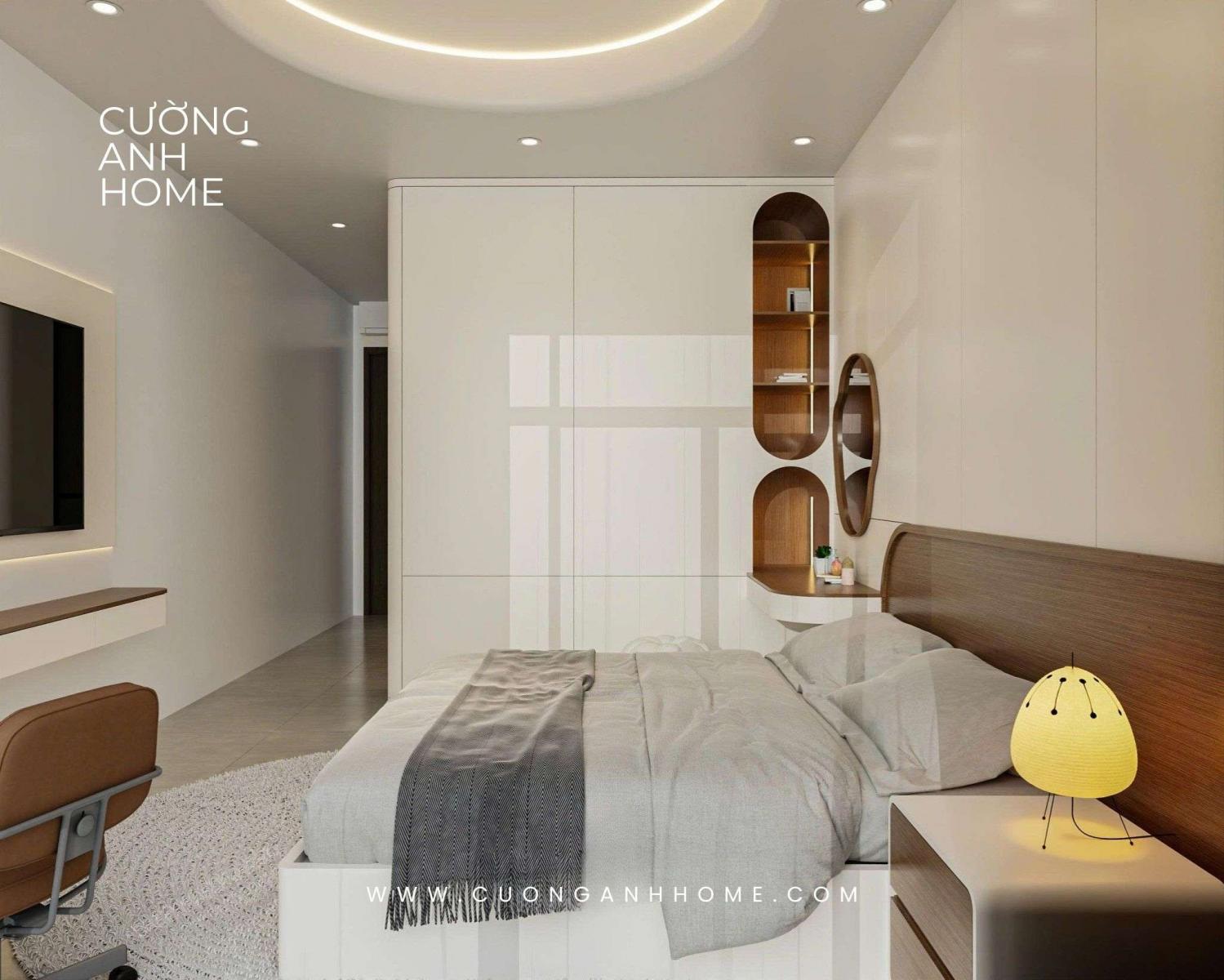 Đối với phòng ngủ nhỏ, Cường Anh Home ưu tiên sử dụng hệ nội thất tích hợp: Giường ngủ liền bàn học và tủ quần áo. Cách bố trí này giúp giải phóng không gian sàn, tạo môi trường học tập và nghỉ ngơi thông thoáng cho các thành viên.