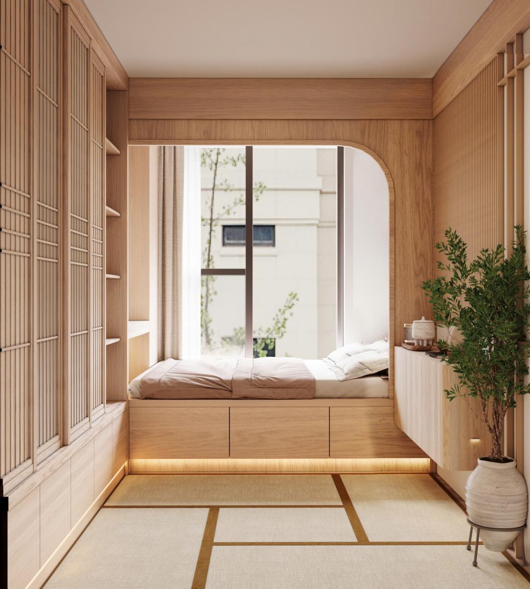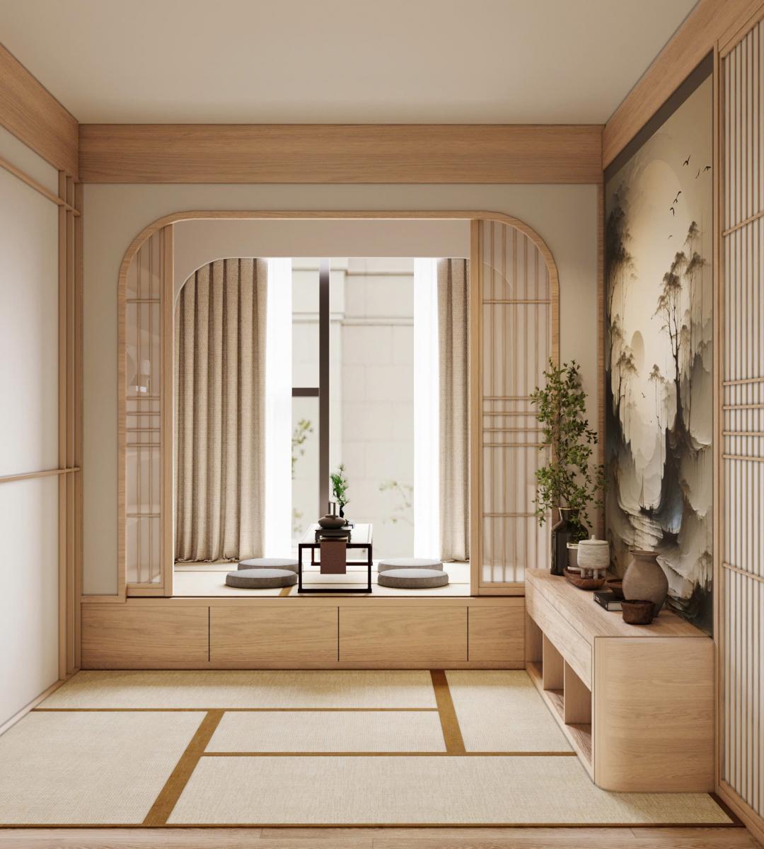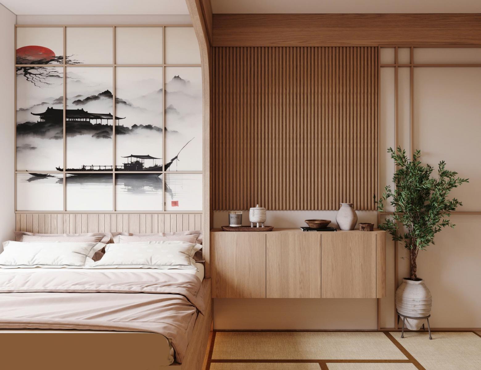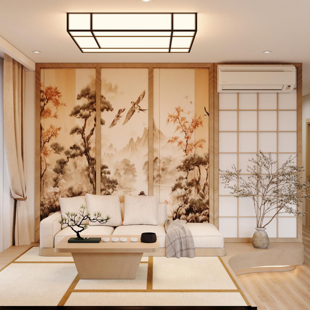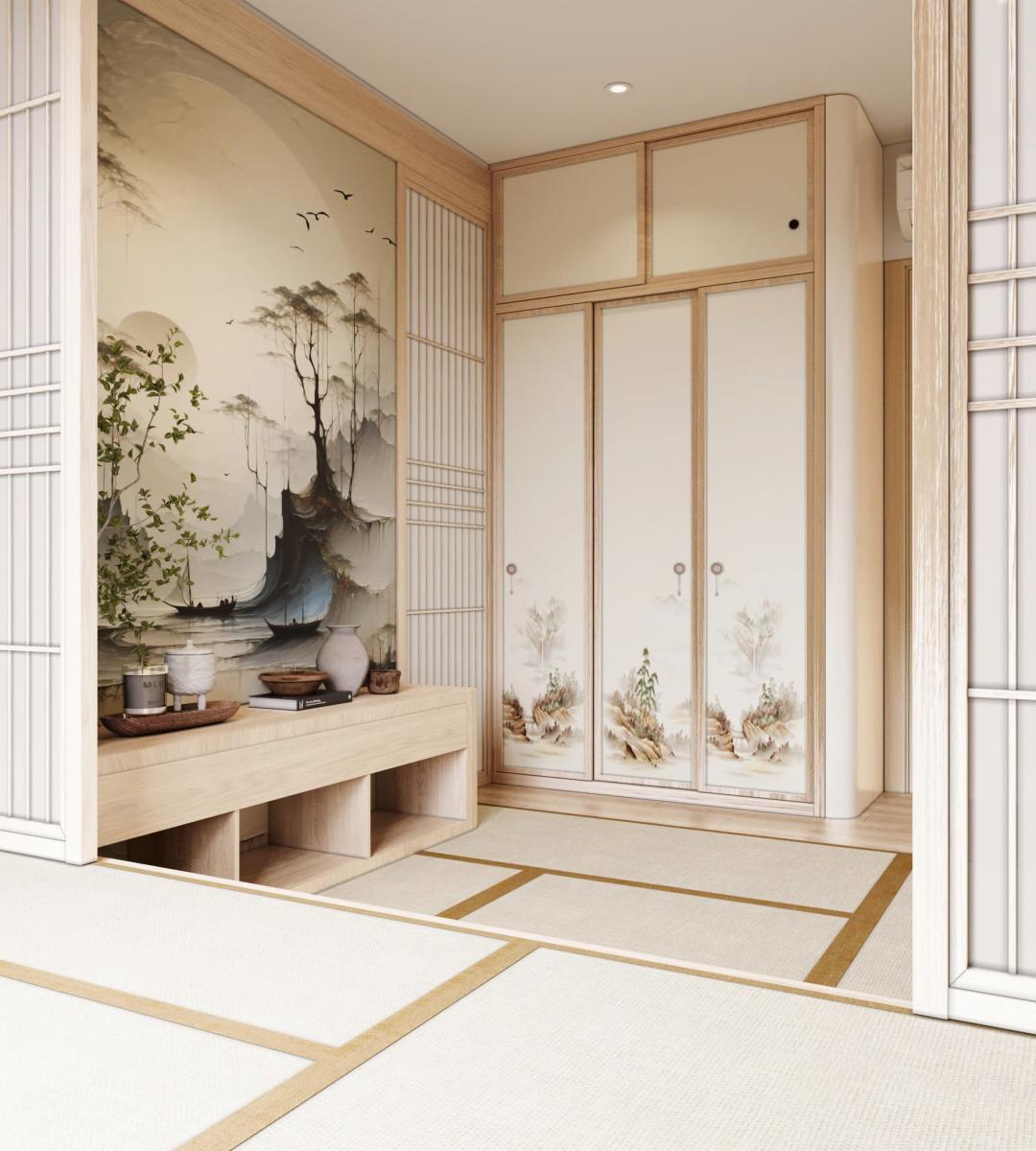 - Giải Pháp Vách Ốp Gần Gũi: Thiết kế vách ốp tranh phong cảnh kết hợp vách ngăn nan gỗ truyền thống. Ý tưởng này giúp ánh sáng khuếch tán mềm mại, tạo chiều sâu và cảm giác thư thái cho căn phòng theo đúng tinh thần Nhật Bản.