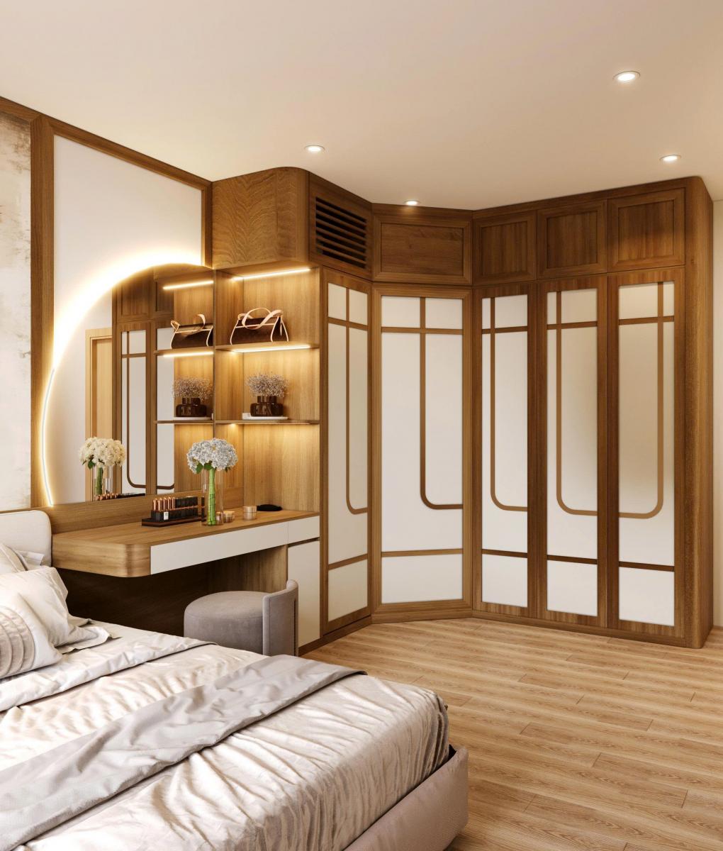 - Tủ Áo Góc Bo Cong Tối Ưu Diện Tích: Hệ tủ áo được thiết kế ôm góc phòng, tiết kiệm diện tích. Đường cong mềm mại ở phần tủ góc và bàn trang điểm được tính toán để tạo cảm giác thanh lịch, không hề cứng nhắc.