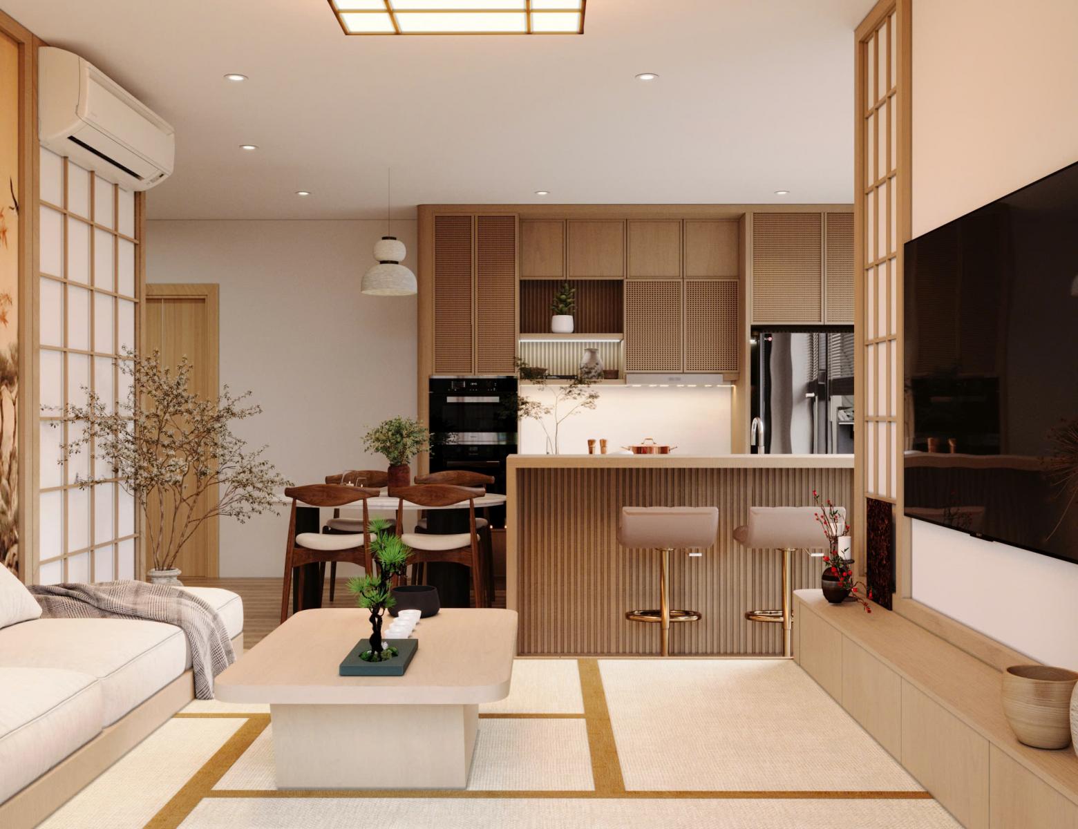Cường Anh Home đã sử dụng tông màu gỗ sáng, kết hợp với các hình khối và chi tiết đặc trưng của kiến trúc Nhật Bản để truyền tải sự tĩnh tại, gần gũi.