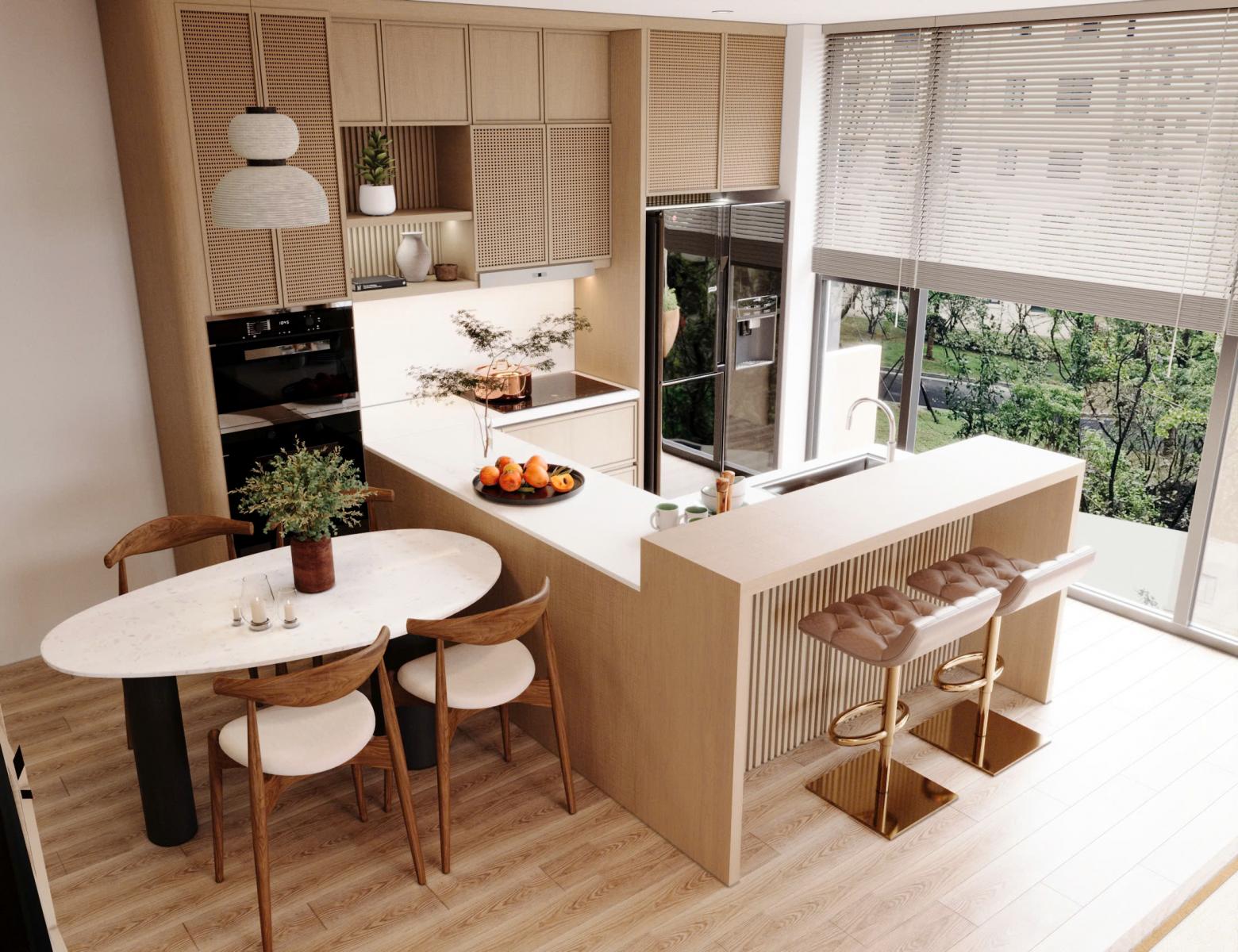 - Thiết Kế Hệ Tủ Nan Gỗ: Tủ bếp trên và quầy bar được thiết kế với chi tiết nan gỗ, vừa thẩm mỹ vừa đảm bảo thông thoáng. Thiết bị lớn được thiết kế âm tủ, mang lại bề mặt tối giản và hiện đại.
