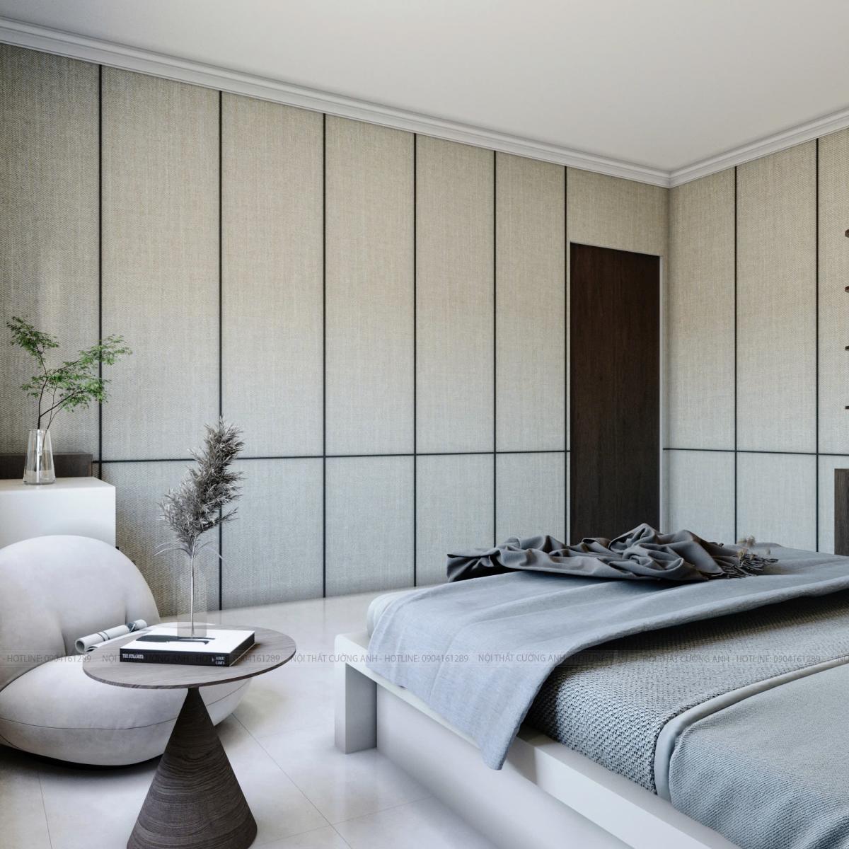 Phòng ngủ là nơi vỗ về cảm xúc sau ngày dài. Chúng tôi sử dụng vách nan gỗ bọc nỉ cùng tông màu trầm để tạo chiều sâu và sự ấm cúng cho không gian nghỉ ngơi.