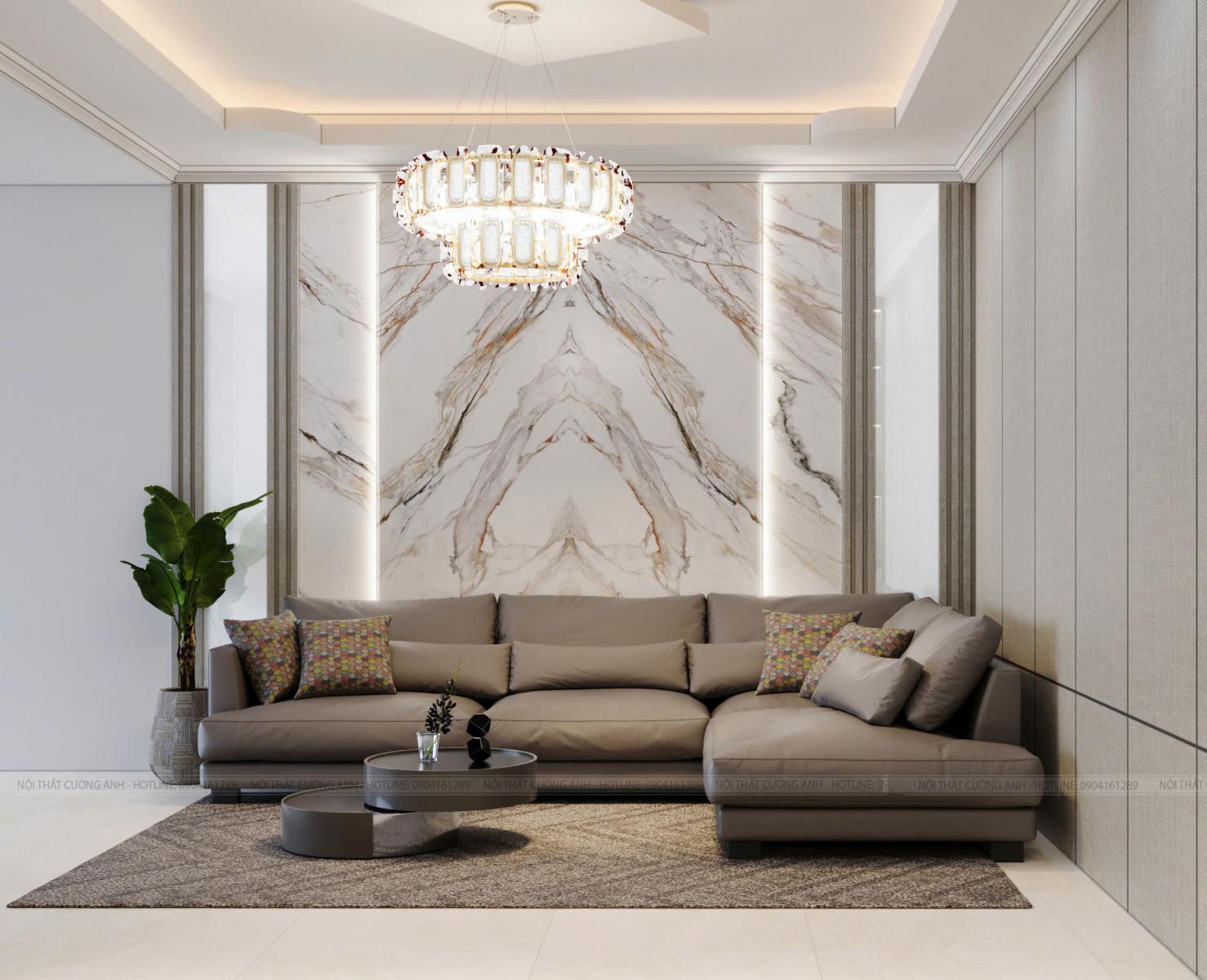 Mẫu Nội Thất Phòng Khách Hiện Đại: Sang Trọng Với Vách Tivi Nan Gỗ Phối Đá